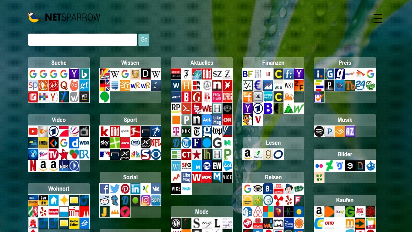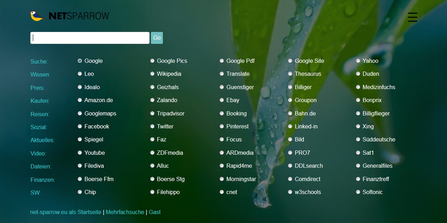 The search matrix queries the result to your search term directly by the functions of the selected website. Default is Google. Therefore, if you click "Go", you immediately get the search results from Google. In principle, the page will behave similarly to the Google home page, but it offers additional benefits as direct branching into various additional searches, which can be extremely time-saving in daily use. If you select "Translate", you directly receive a translation, if you select "Amazon", you'll immediately find the associated products, or if you select a price search engine you get the price comparisons of the product in the search field. Test it yourself. You can personalize / supplement the Web links in the search matrix. Double-click on a name in the matrix of netsparrow and you will directly reach the associated website.